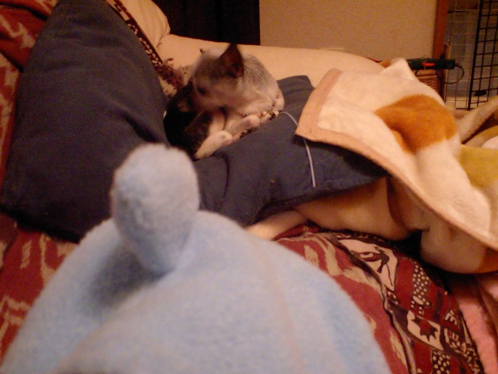 おやつのトサカを食べて、お腹もふくれ、のんびり毛づくろいをするぼにたん。