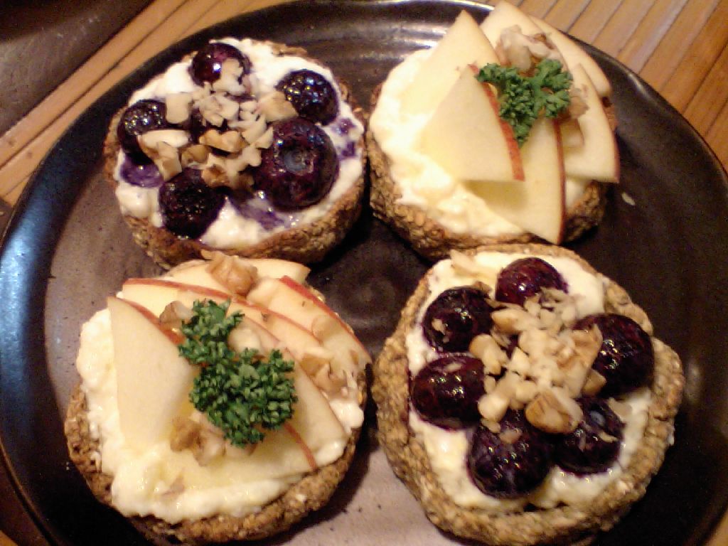 オートミールにレバーとごまとバジルを練り込んだタルト生地に、ヤギミルクとウズラ卵で作ったカスタードクリームを詰めて、ブルーベリーとりんごを乗せて、くるみをトッピング。
