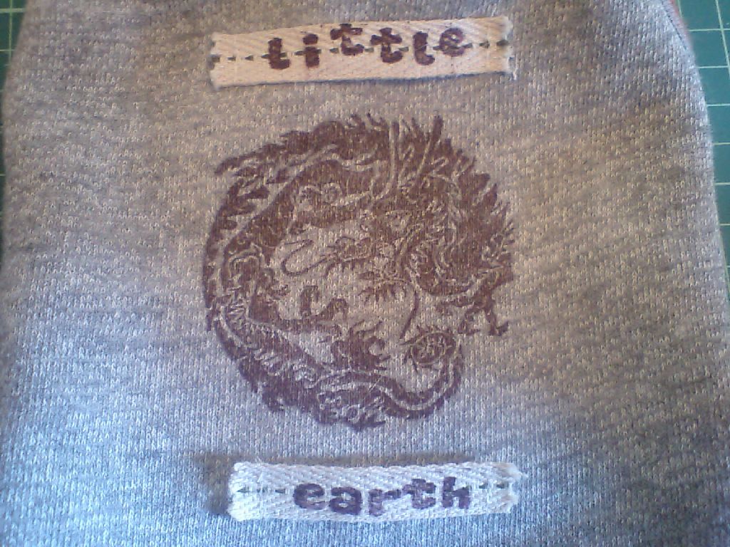 真ん中に大きく龍のスタンプ。そして、リネンテープにロゴをスタンプして縫いつけました。